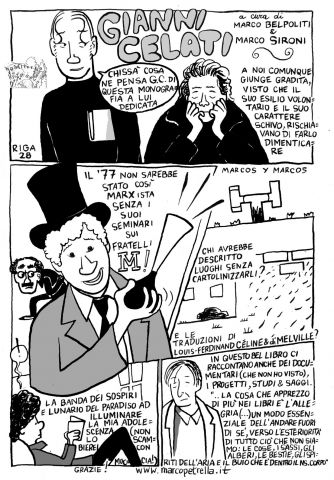 Questo volume di «Riga», omaggio per il suo settantesimo compleanno, caduto due anni fa, vuole rendere conto del suo intero percorso attraverso una copiosa serie di testi inediti, tra cui la riscrittura di Comiche, realizzata nel 1972, subito dopo la sua pubblicazione, un percorso autobiografico composto dall’autore stesso, scandito da conversazioni realizzate con amici, traduttori e critici, pezzi di viaggio (nel Sud dell’Italia, a Nairobi), racconti, saggi e studi (su Giacometti, sul comico, sulla fotografia italiana, sul narrare, su Wim Wenders). Aprono il volume testi di scrittori (Arminio, Benati, Cavazzoni), segue la raccolta di alcune delle recensioni dei suoi libri apparse nel corso degli anni, opera di critici e scrittori come Calvino, Gramigna, Ghirri, Scabia, Giuliani, Starnone, Marcoaldi… Il volume comprende una scelta di fotografie inedite di Celati, commentate da didascalie dettate da Celati stesso. Una serie di studiosi di diverse generazioni ha scritto per questo volume alcuni saggi nuovi dedicati all’opera di Celati. Completano il volume gli interventi di due fotografe, Roberta Sironi e Marina Ballo Charmet, dedicati a temi assai vicini all’opera di Celati: l’abitare provvisorio e il paesaggio urbano.